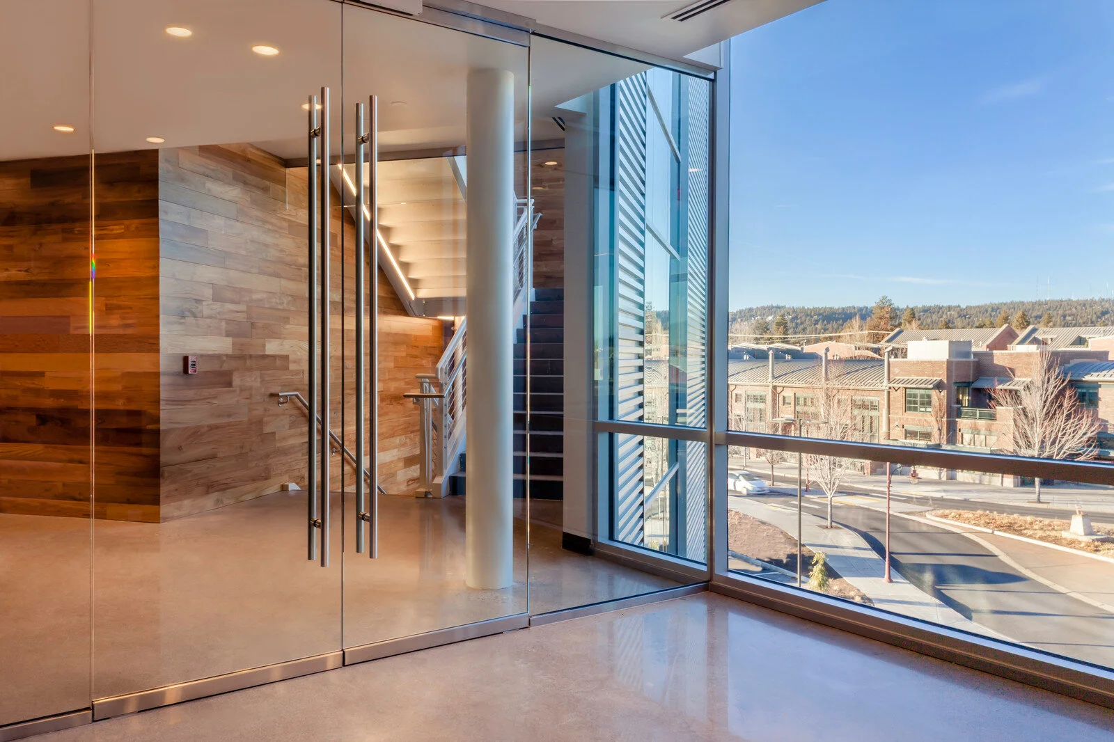 This multi-use space located in Bend, Oregon, shows how reclaimed teak wood can shine in a contemporary shared office design. Our old-growth reclaimed Sakhay Teak solid wall paneling clads the walls along the stairway, which provides panoramic views of the high desert with expansive windows.