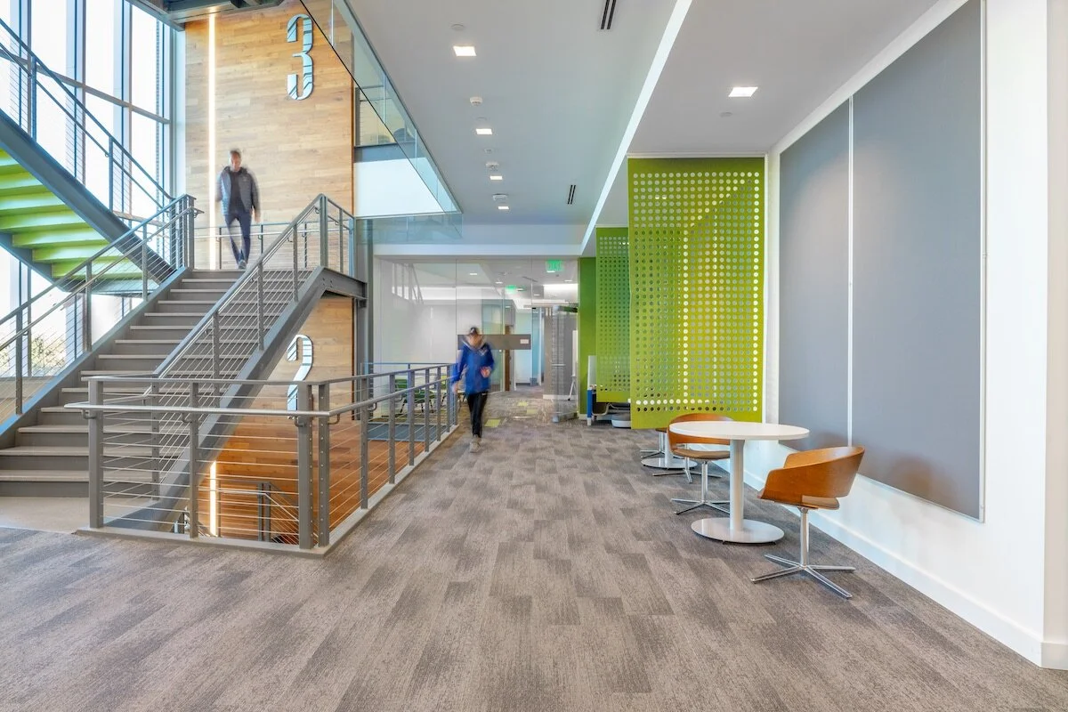 The Fidelity office in San Francisco exemplifies how reclaimed and salvaged wood can balance a high-tech, modern open office design. Salvaged Left Coast White Oak ThinClad paneling is used throughout the office, complementing the green wall and bright geometric accents in the space.