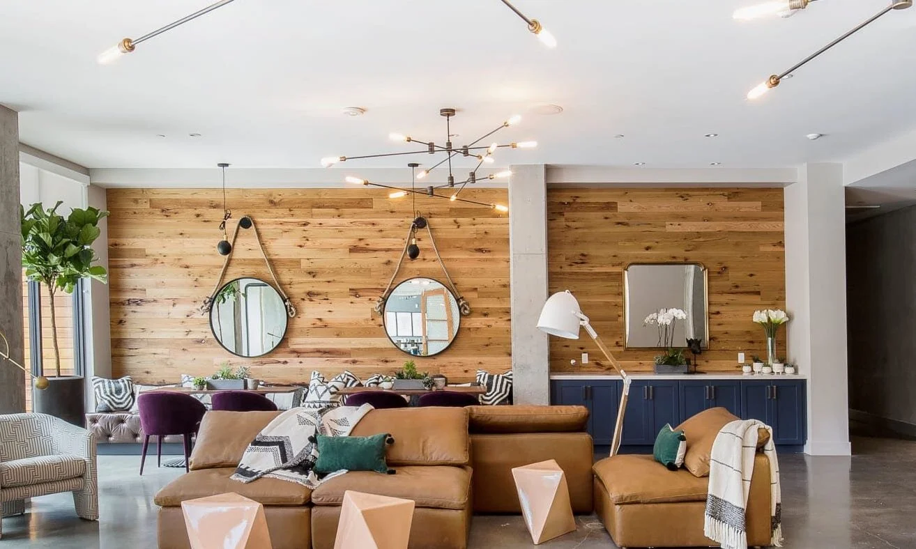 This hip and luxury apartment building, designed by Parisa O’Connell Designs, showcases reclaimed Heritage Oak tongue and groove wall paneling, which is resurfaced to show the beautiful character and grain patterning of the oak. The character grade wood adds personality and comfort to the modern, light-drenched lobby, welcoming guests in the space.