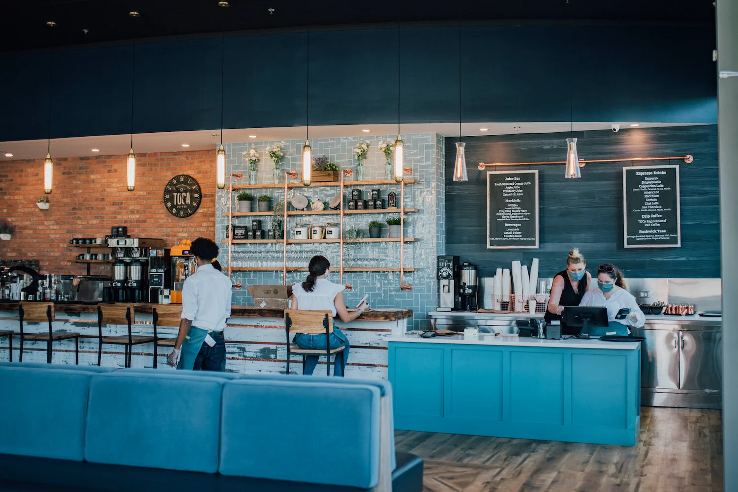 This hip cafe in Wyckof, NJ serves up bold and modern design with its upscale comfort food. A slate-toned feature wall with reclaimed Blackboard Pine wood wall cladding adds contrast to the opposing brick wall. The wood used for this project was reclaimed from high school bleachers, and have been transformed and reimagined in this elevated cafe interior.