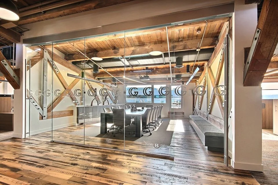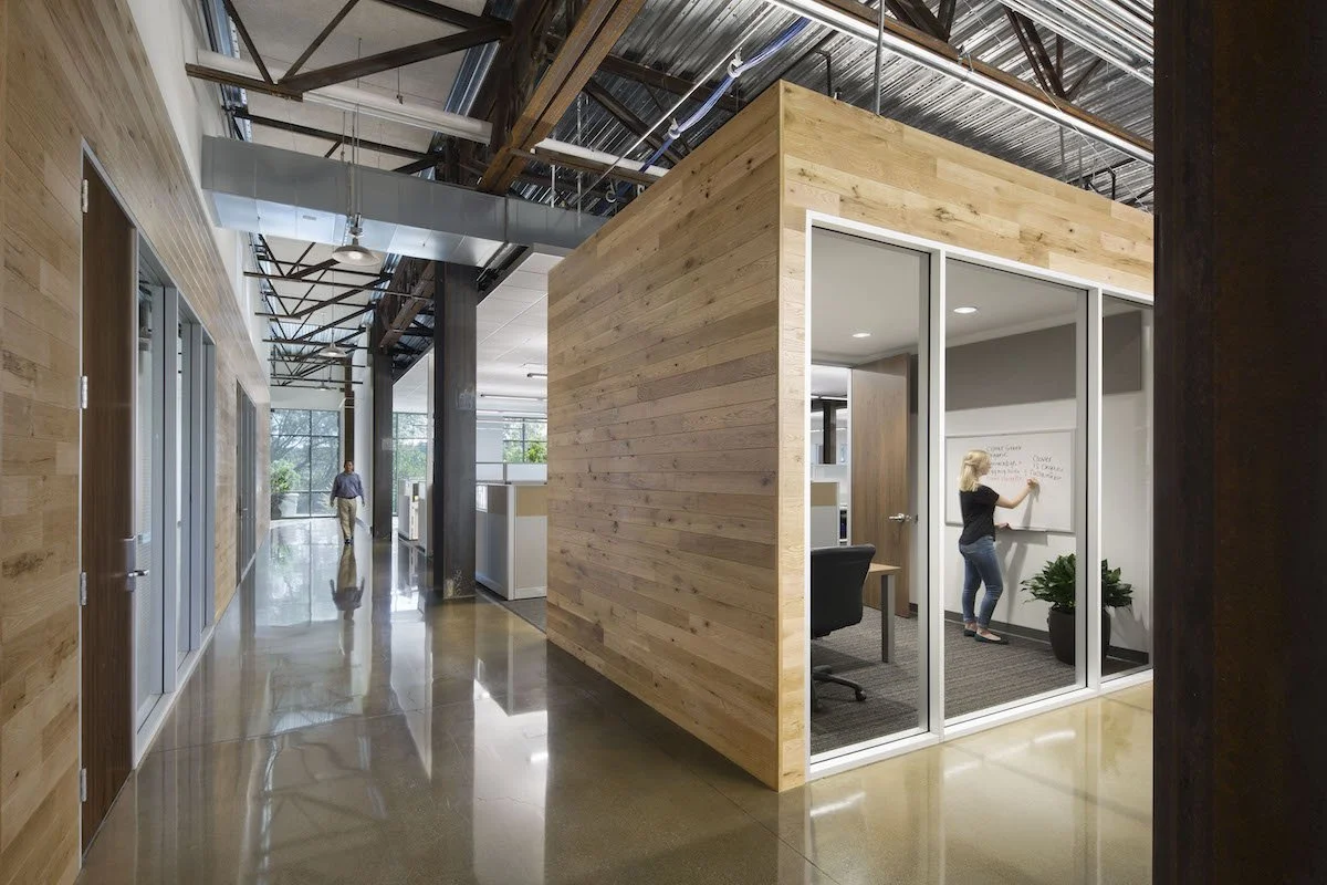 Reclaimed wood beams and beam wraps can be an aesthetic and structural addition to an office space, enhancing a rustic and industrial look.