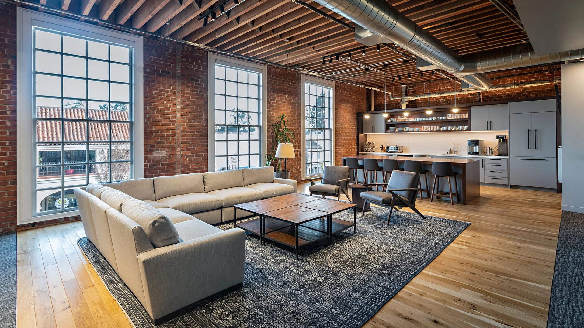 Solid or engineered hardwood flooring is an excellent option for making the workplace feel more warm and comfortable. Creating separate smaller workplaces, like the Airbnb headquarters, that feel more like living rooms, can create effective collaborative space for smaller groups or an inviting space for meeting with clients.