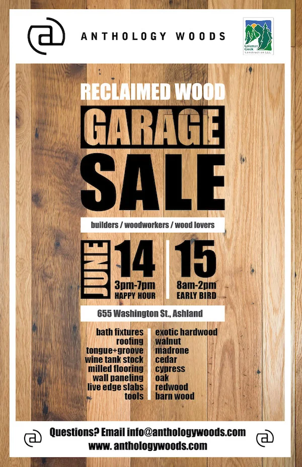 We are excited to host our first ever garage sale here in Ashland, OR. We will be offering a variety of quality reclaimed, salvaged and FSC® Certified wood in a variety of dimensions at amazingly low prices! This wood is perfect for home projects, woodworking and crafting, and small-scale building projects. Whether you make cabinets or cutting boards, or want to build out the most beautiful tiny home, you’ll find incredible deals on quality reclaimed wood. If you love wood, you need to come check out what we’ve got!