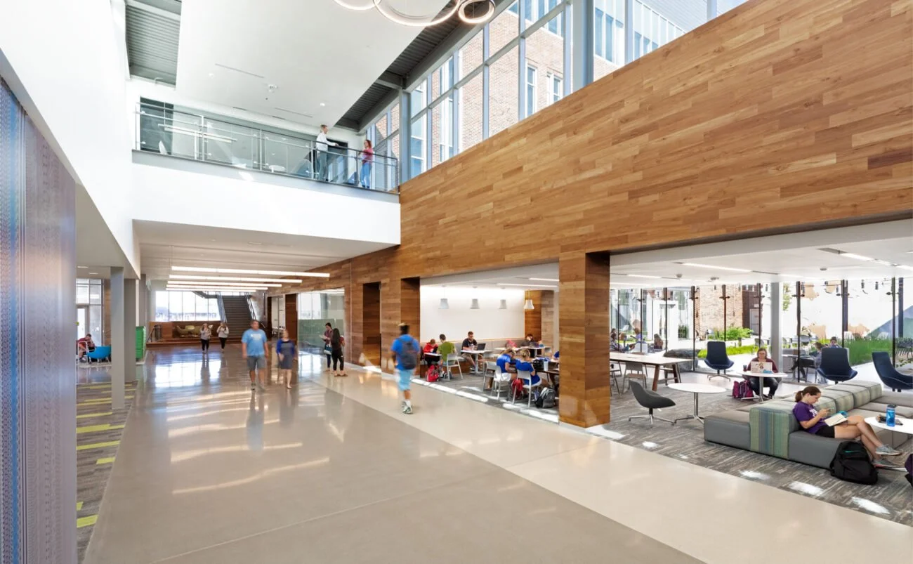 FSC certified Reclaimed Sakhay Teak wall paneling at LEED Silver certified campus building at Indiana State University