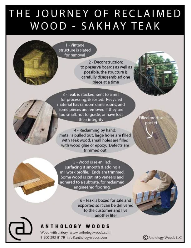 The info graph below explains the journey of our Reclaimed Teak, as it is reclaimed and reincarnated for another life. The hands-on labor involved in reclaiming wood indicates why reclaimed wood often costs more than new wood.