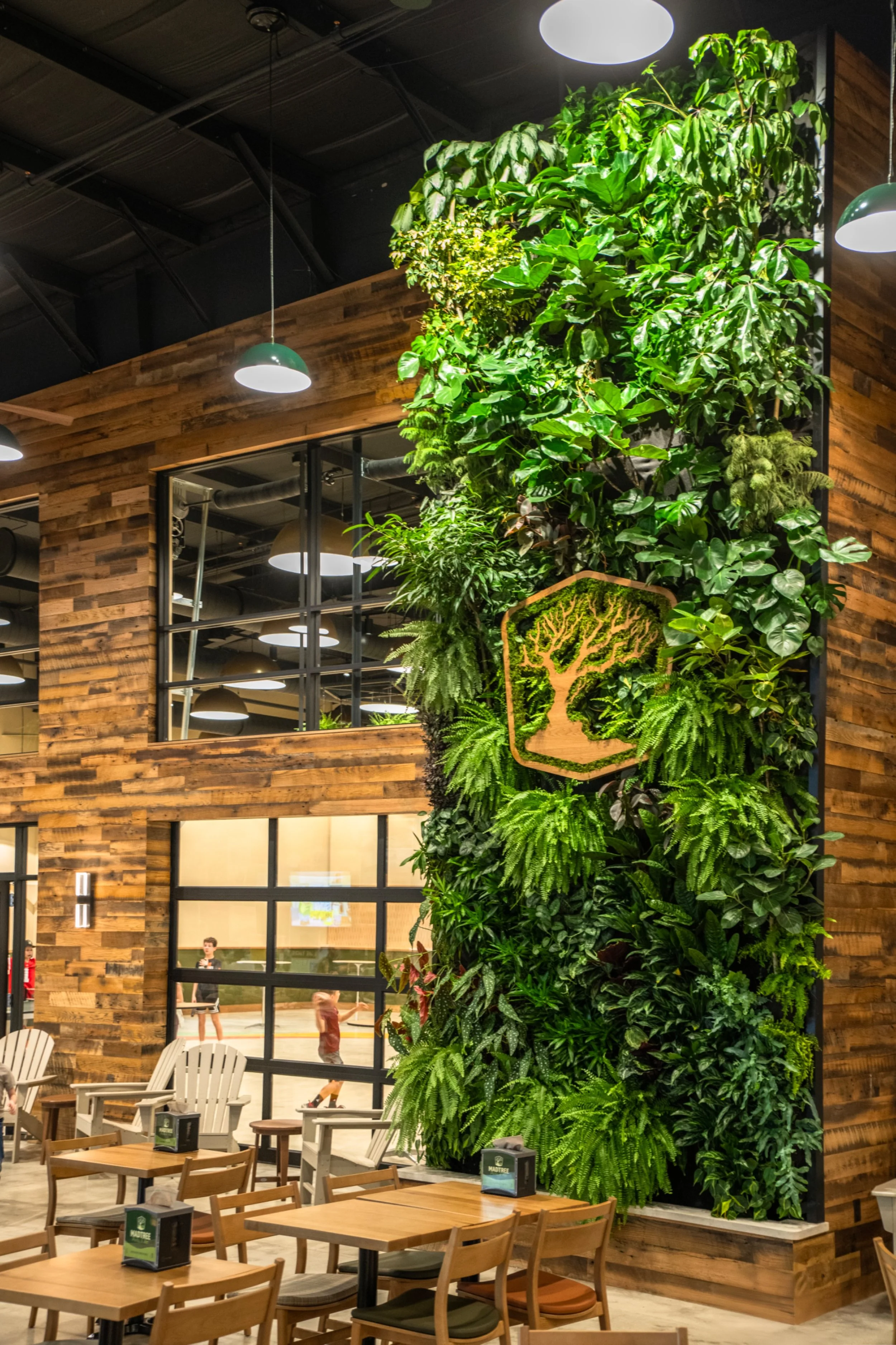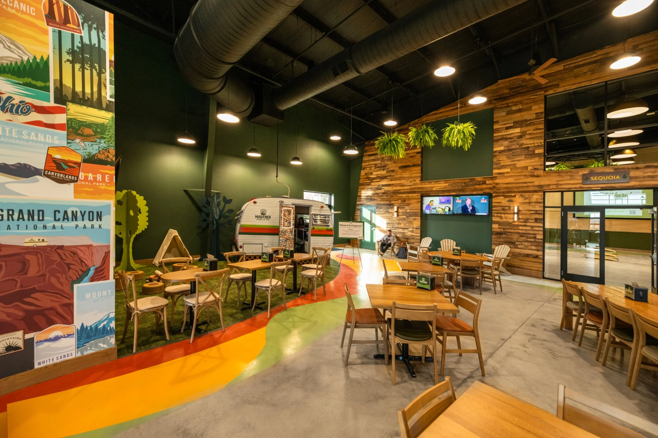 Lush greenery is integral to the experience, with living walls and suspended “botanical chandeliers” layering plant life throughout the interior. The design draws on camping and national park imagery, expressed through rustic textures, immersive spatial moments, and a relaxed, outdoors-inspired atmosphere. At the center of the bar, a realistic, large-scale tree sculpture becomes a focal point, reinforcing the sense of being within a constructed landscape. These elements work together to blur the line between built space and nature, creating an environment that feels both playful and grounded.