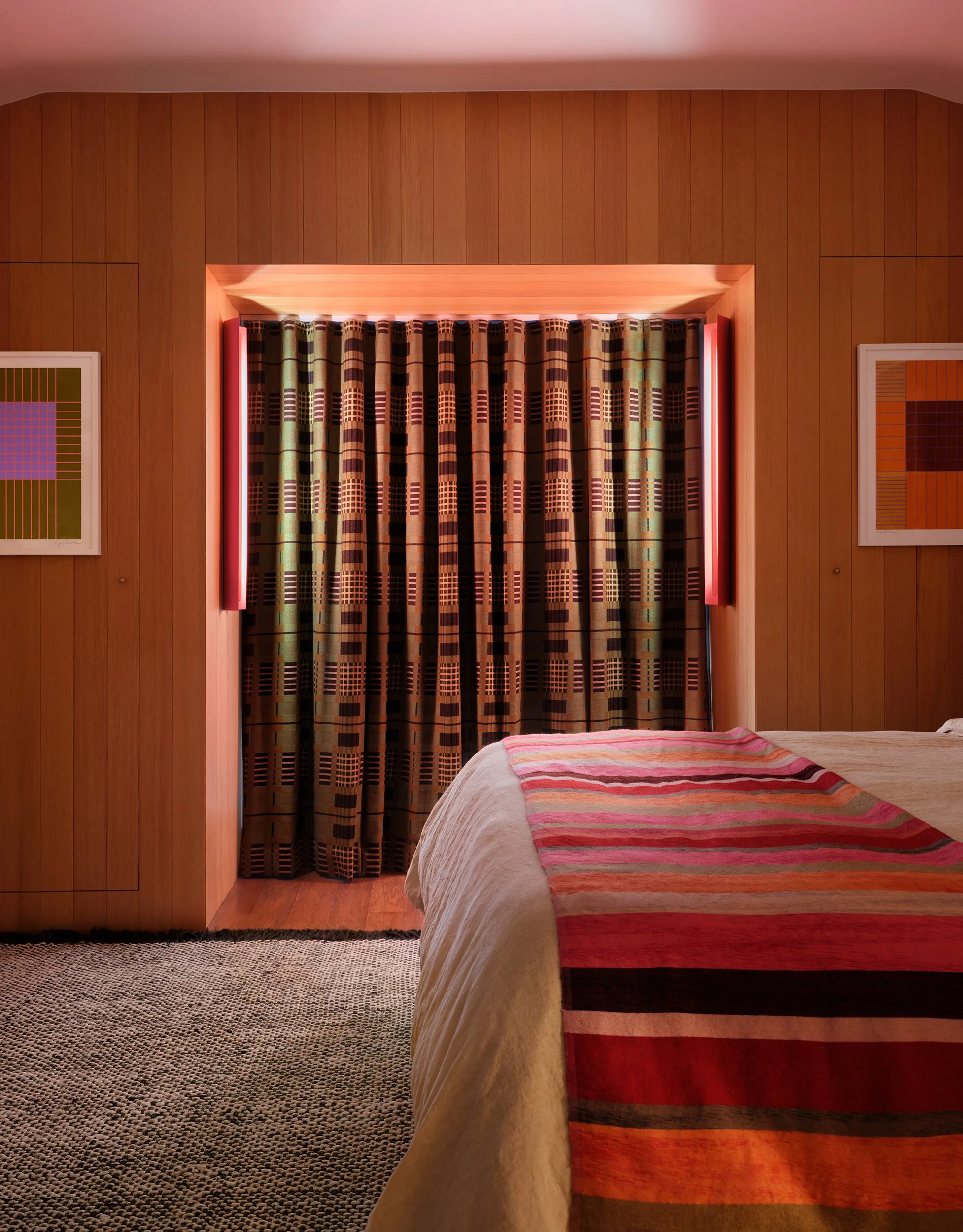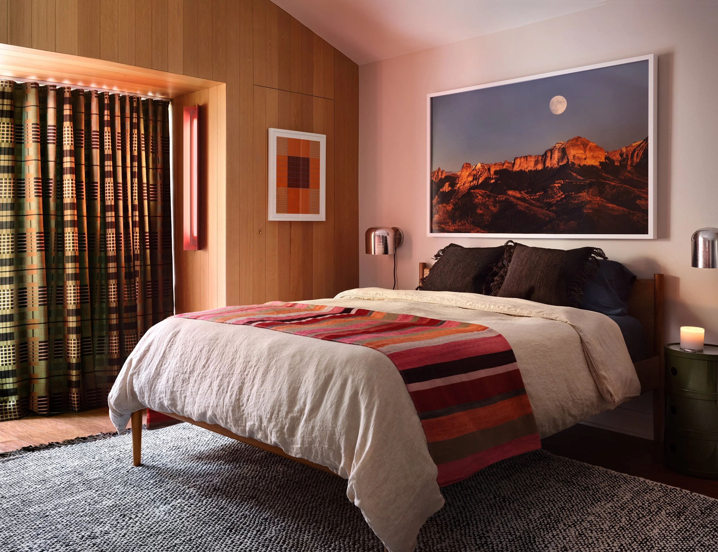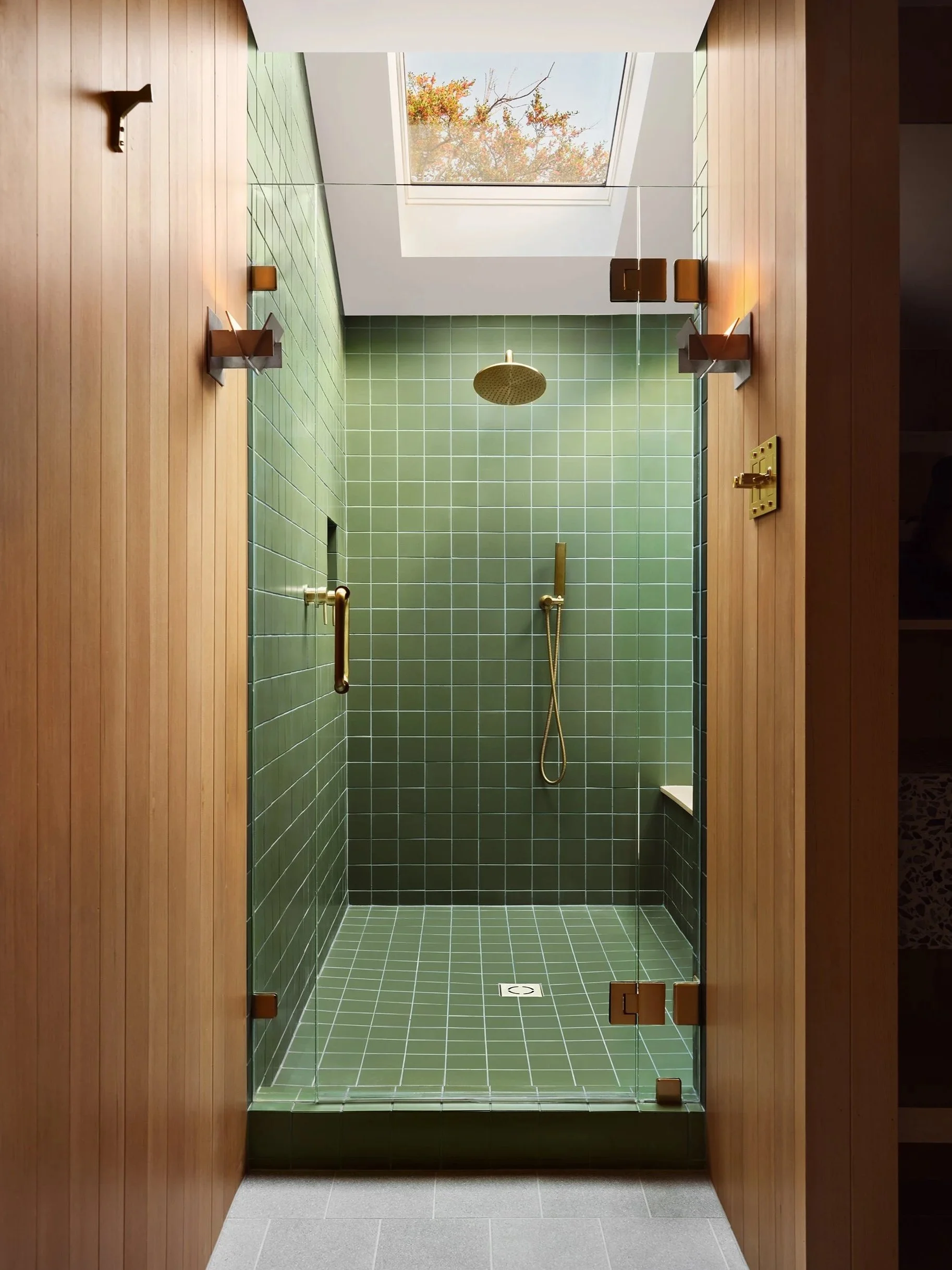 This recent Dallas remodel is a calming at-home getaway with a mid-century modern flair. Elegant, but far from being garish, its refinement is in the details. Gentle daylight streams through the skylight Modern sconces provide diffuse light. Punch World Studio provided the vision for the personality of the space, offering eclectic twists to a highly elegant atmosphere. Warm wood paired with pops of bold color— like the green tile shower and terrazzo counter combo— Pops of cool, calming green are the perfect complement Subtle brass fixtures tie this mid-century modern suite together. Moving into the bedroom, the mid-century aesthetic becomes more apparent.