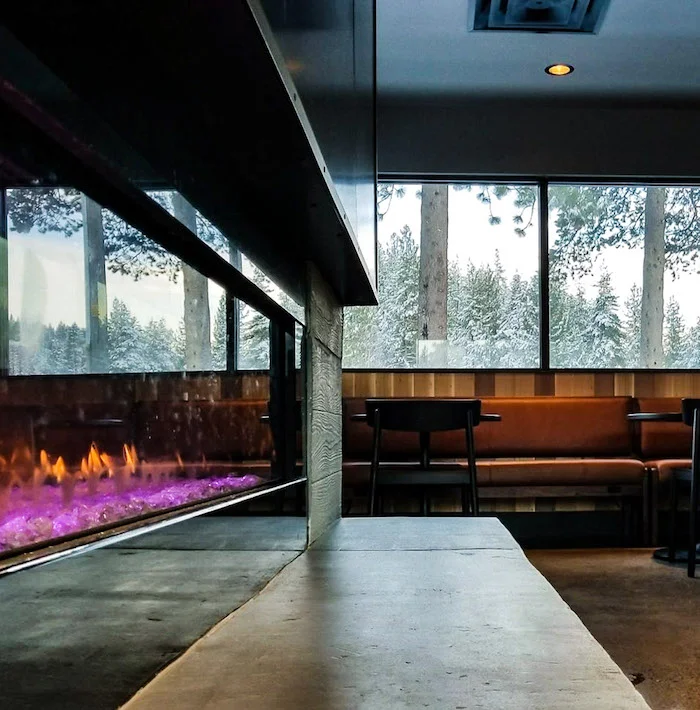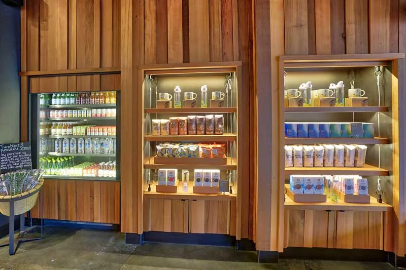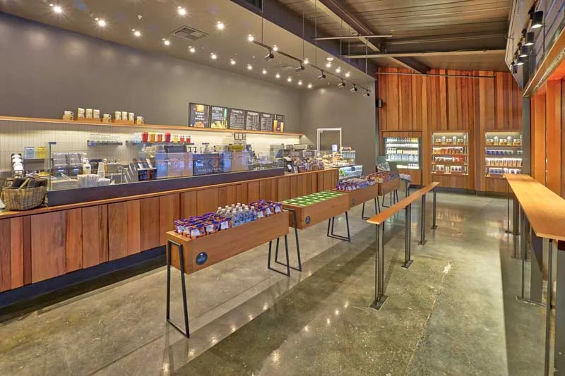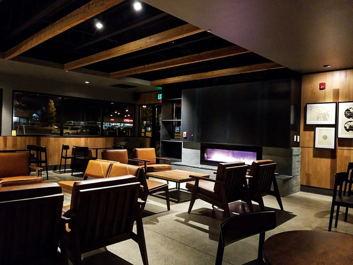 Starbucks Truckee: At the Starbucks Truckee location, custom reclaimed cedar wall paneling adds to the alpine atmosphere, where customers can cozy up to a fireplace as they sip their pumpkin spice lattes in the winter.
