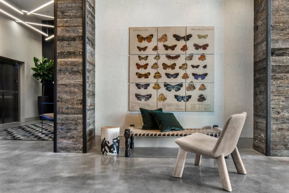 The lobby showcases our reclaimed Grey Medley Oak ThinClad Wall Paneling, which offers a contrast to the luxurious accents in a thoughtful and tasteful way. The natural patina of the wood creates a spectrum of gray and silver tones, complementing the color palette of the space.