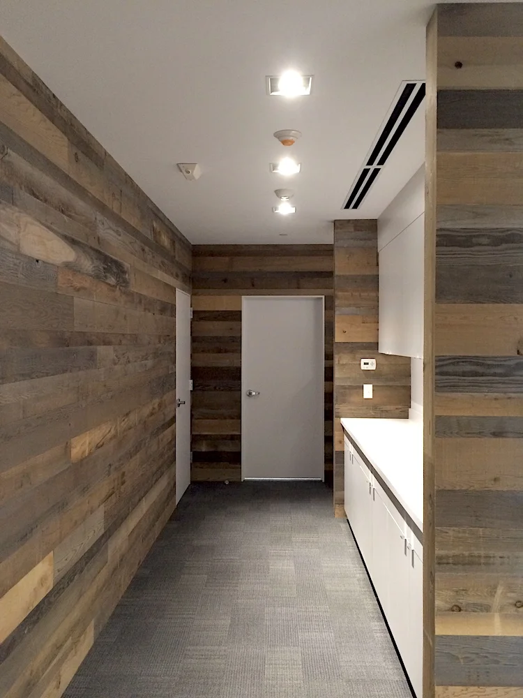 Substance Architecture designed this retail space with a fusion of modern, rustic, and industrial influences in the aesthetic. They initially leaned toward a silvered wood finish, with some interest in exploring a darker reclaimed wood as well. Anthology Woods supported the architect in pursuit of the perfect wood by offering options in the right color tone range which were suited to the custom application of floating shelves in the specified size as well as tongue & groove wall cladding.