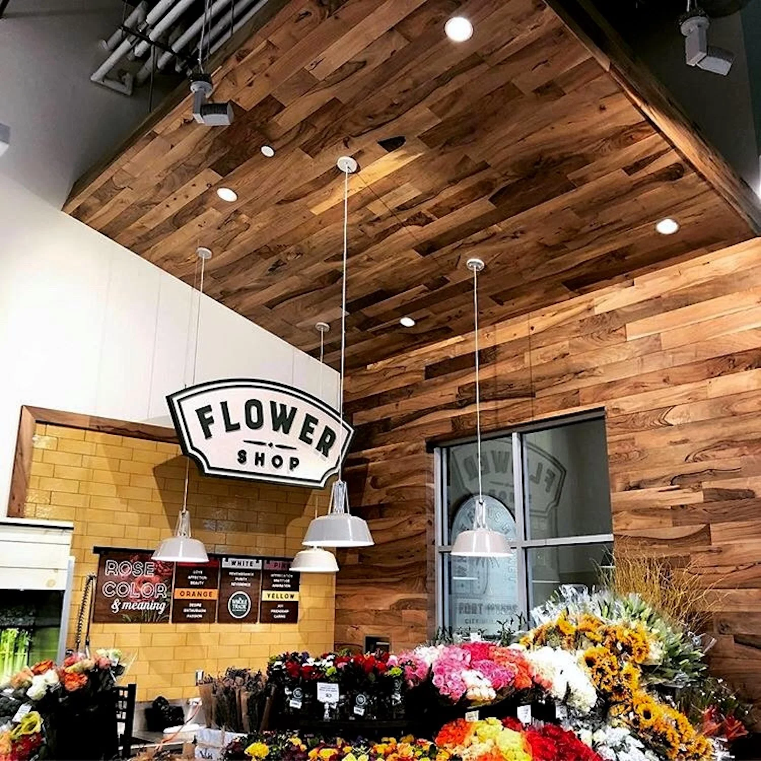 Fort Myers: Reclaimed Bidwell Walnut ThinClad wall paneling arches high above areas in the supermarket, creating a warm and inviting shopping experience for customers within the expansive 45,000 square foot space. The deep grain and diverse range of rich colors of the walnut add depth to the space and create textural interest as paneling, amidst fresh-cut flower displays and behind customer service desks. Our unique ThinClad paneling was a perfect choice as an appealing and economical interior cladding that uses fewer wood resources while delivering a clean finished look.